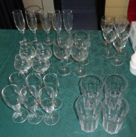 GRATIS : 6 gelijke en 5 gelijke (hoge) champagneglazen, 4 cognac glazen, 4 rode en 5 witte wijn glazen, 4 frisdrank glazen.