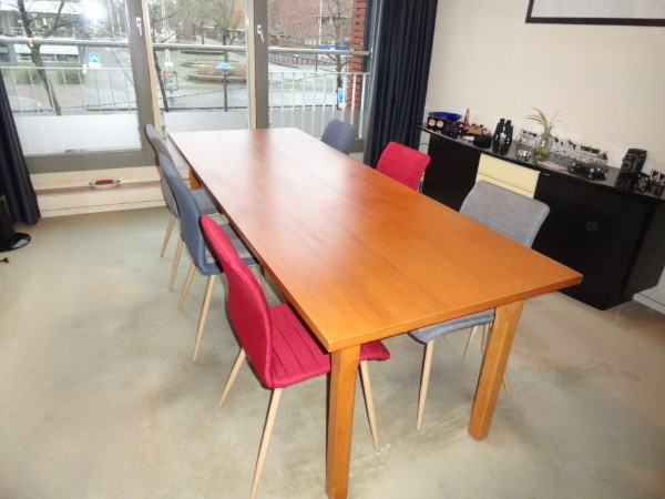 TE KOOP (Familie prijzen): grote eettafel 240 cm lang x 90 cm breed en 75 cm hoog. In redelijk goede staat (paar kleine gebruikskenmerken). Er zit een lade in het midden voor kleine spullen of bestek.