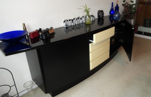 Ook te koop voor schappelijke familieprijs. Dressoir van 225 cm lang/breed x 50 cm diep en 75 cm hoog. Zoals je ziet in zwart uitgevoerd met 4 gele laden en links en rechts kastjes. Heeft een paar zeer kleinen 'onvolkomenheden' die zeker niet storend zijn of heel erg zichtbaar. Lekker veel bergruimte.