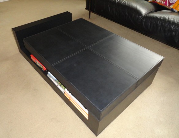TE KOOP (voor weinig!): fraaie salontafel in uitstekende conditie. Het topblad is in zwart leer uitgevoerd. Veel ruimte voor allerhande spullen of boeken. Solide is de beste omschrijving voor deze forse jongen (140 cm lang x 80 cm breed).